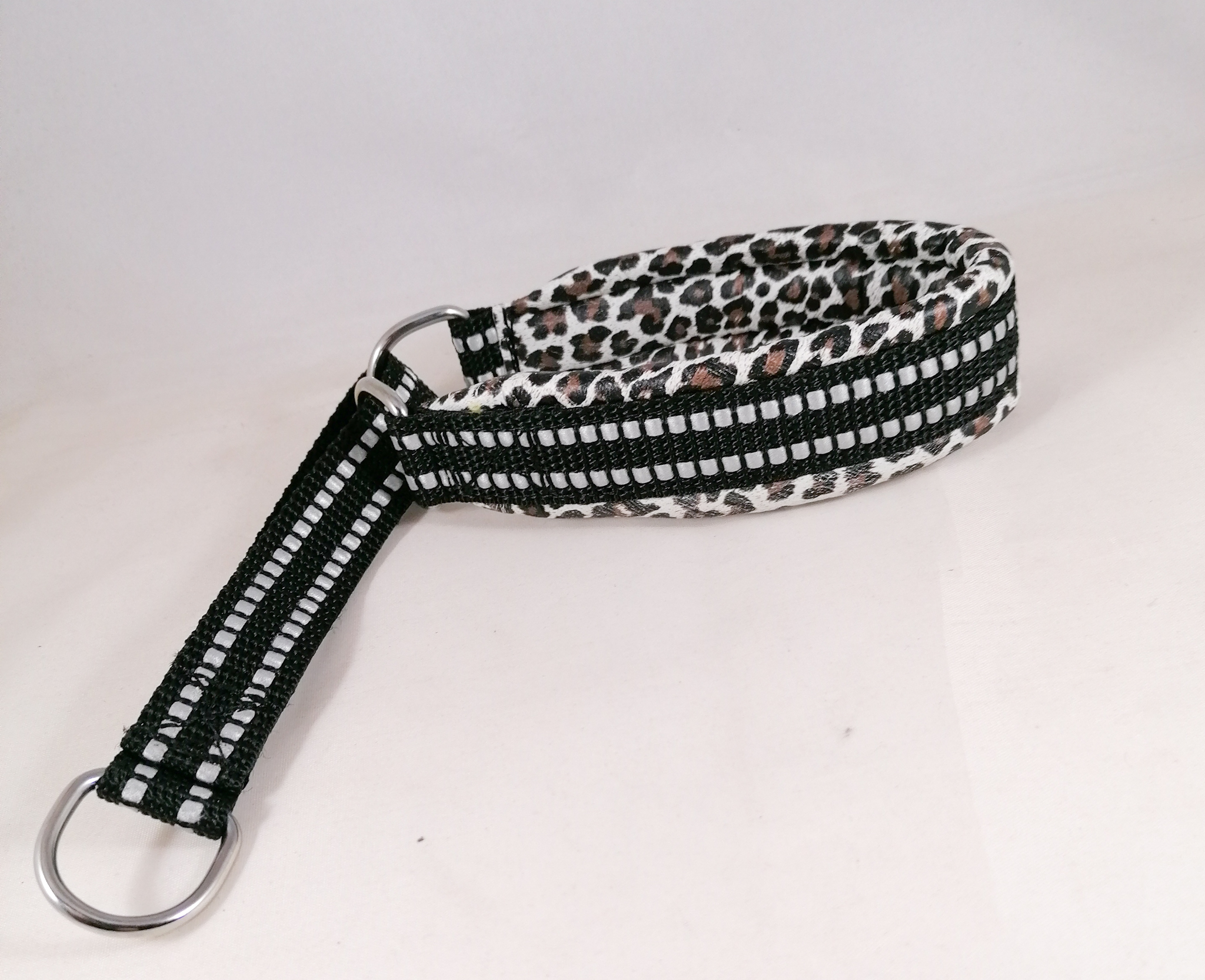 Puolikiristävä nahalla pehmustettu heijastinpanta. Leveys n. 3 cm. Sisämitta kireimmillään 28 cm. Pehmusteen väri valkoinen leopardi. Kiristävä osa heijastinnylonnauhaa.