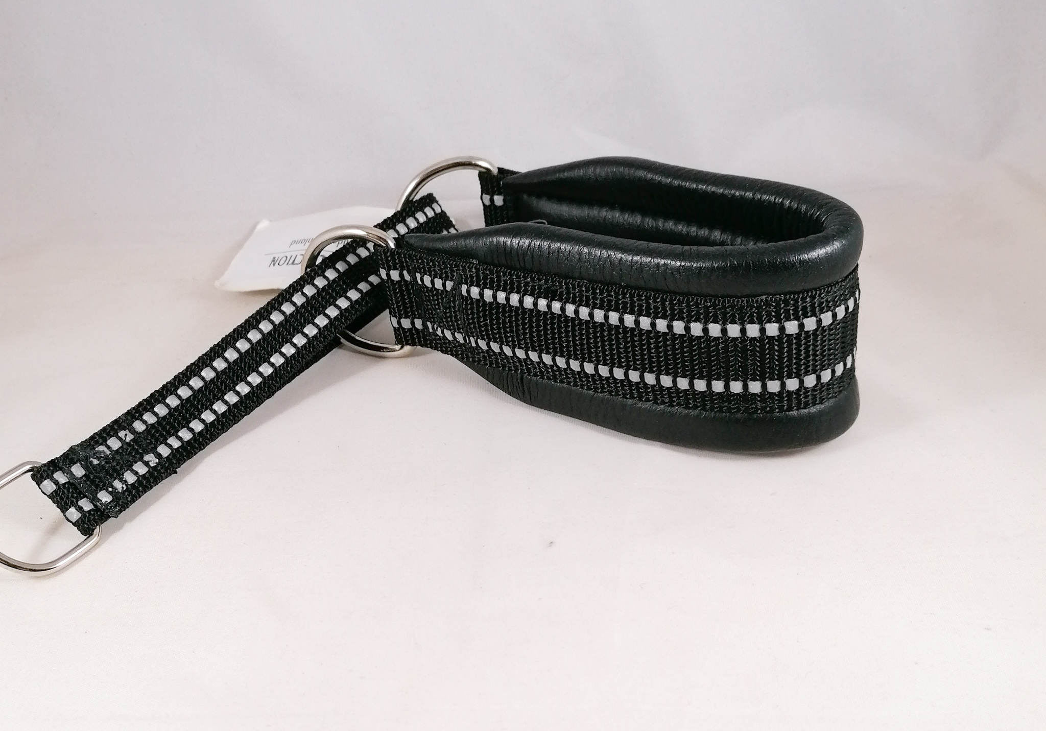 Puolikiristävä nahalla pehmustettu heijastinpanta. Leveys n. 5 cm. Sisämitta kireimmillään 30 cm.