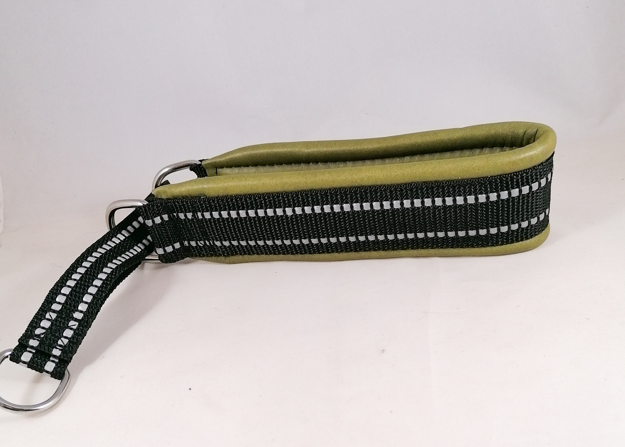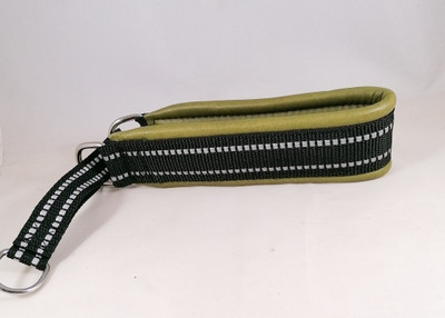 Puolikiristävä nahalla pehmustettu heijastinpanta. Leveys n. 4,5 cm. Sisämitta kireimmillään 38 cm. Pehmusteen väri oliivinvihreä. Kiristävä osa heijastinnylonnauhaa.