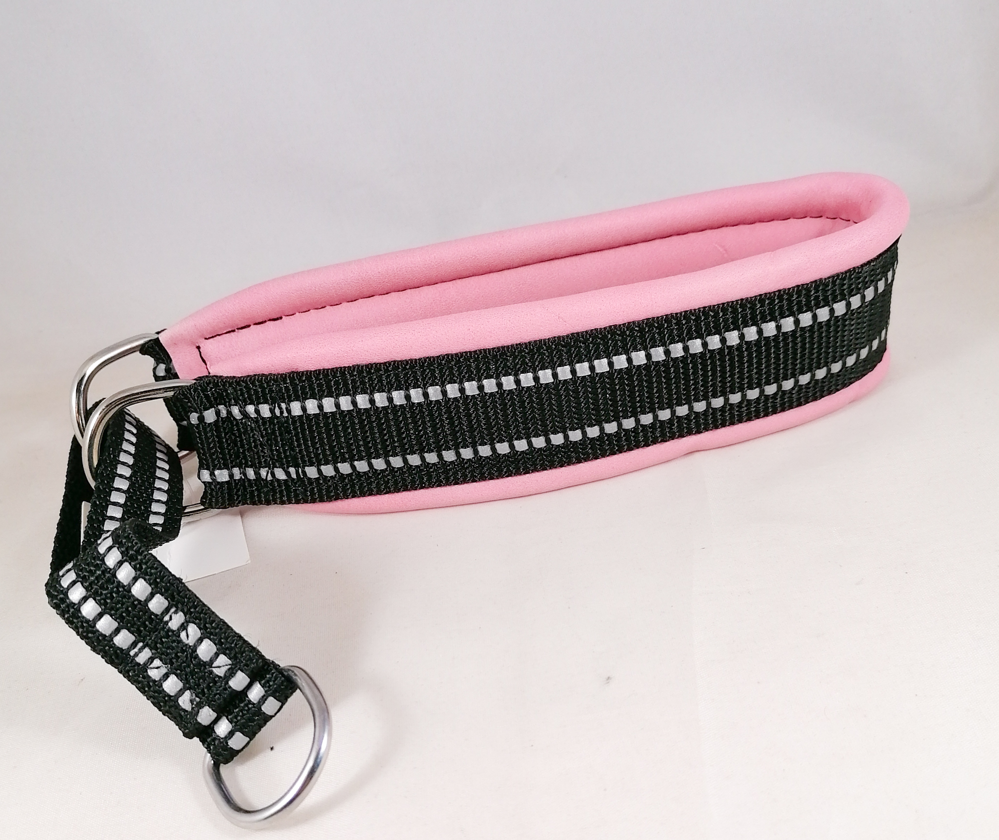 Puolikiristävä nahalla pehmustettu heijastinpanta. Leveys n. 4,5 cm. Sisämitta kireimmillään 41 cm. Pehmusteen väri vaaleanpunainen. Kiristävä osa heijastinnylonnauhaa.