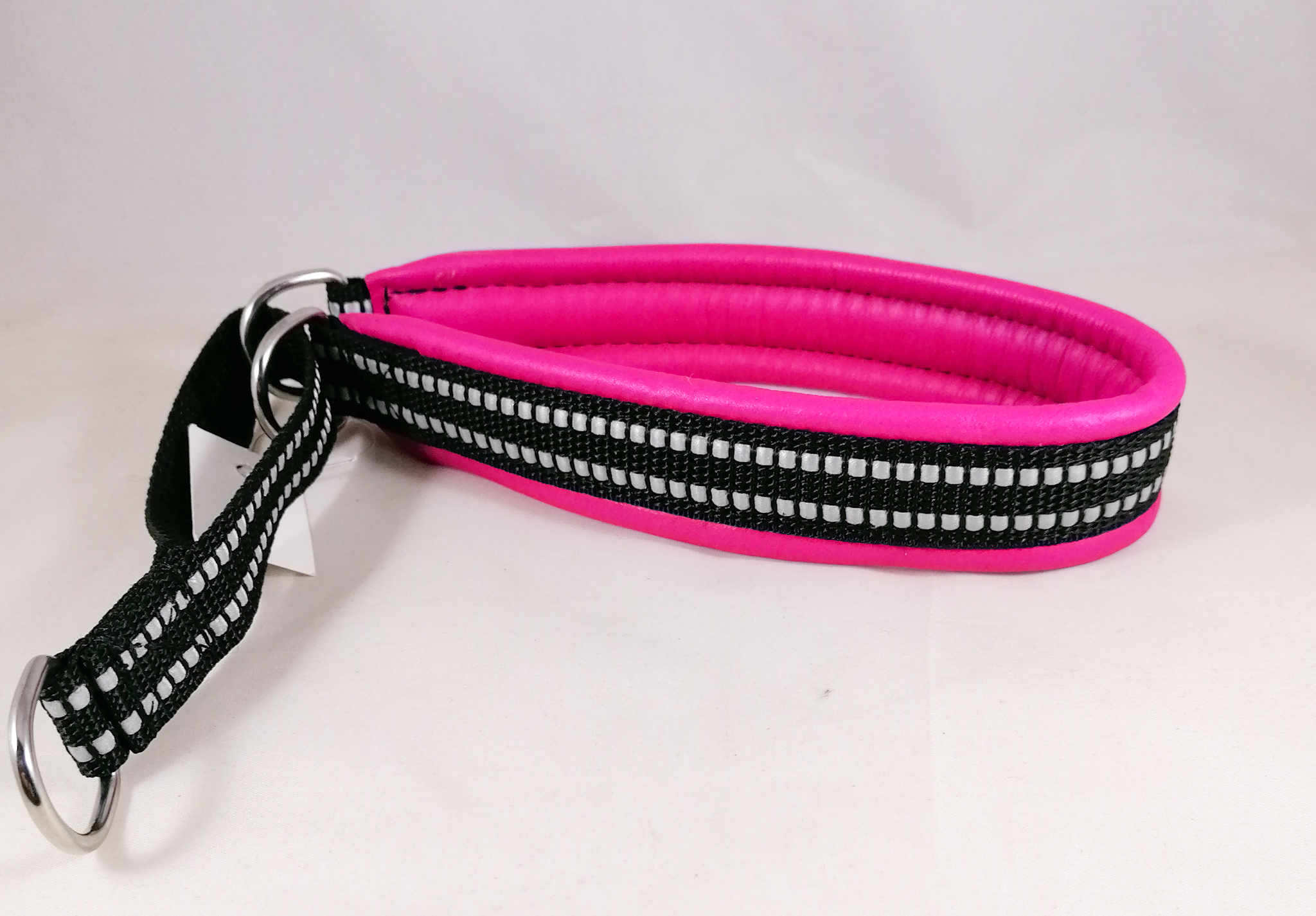Puolikiristävä nahalla pehmustettu heijastinpanta. Leveys n. 3 cm. Sisämitta kireimmillään 41 cm. Pehmusteen väri pinkki. Kiristävä osa heijastinnylonnauhaa.