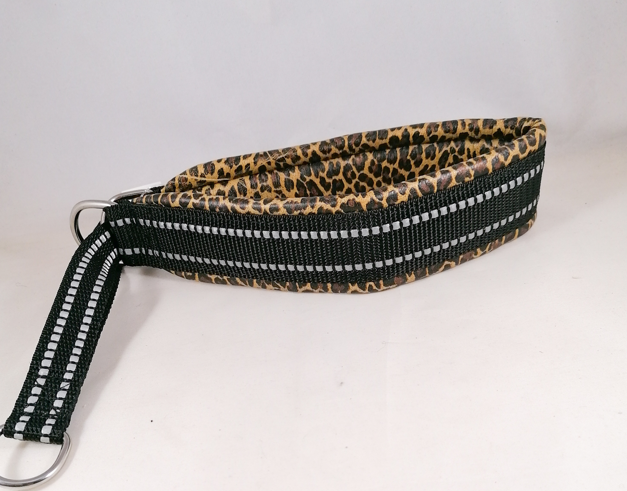 Puolikiristävä nahalla pehmustettu heijastinpanta. Leveys n. 4,5 cm. Sisämitta kireimmillään 43 cm. Pehmusteen väri vaaleanruskea leopardi. Kiristävä osa heijastinnylonnauhaa.