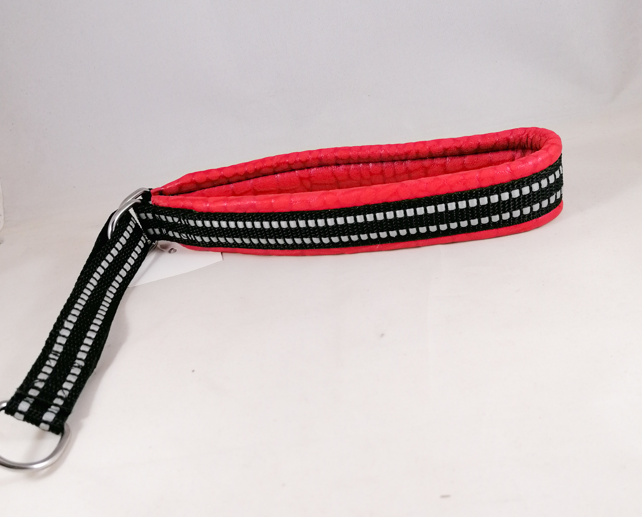 Puolikiristävä nahalla pehmustettu heijastinpanta. Leveys n. 3 cm. Sisämitta kireimmillään 44 cm. Pehmusteen väri punainen croco. Kiristävä osa heijastinnylonnauhaa.