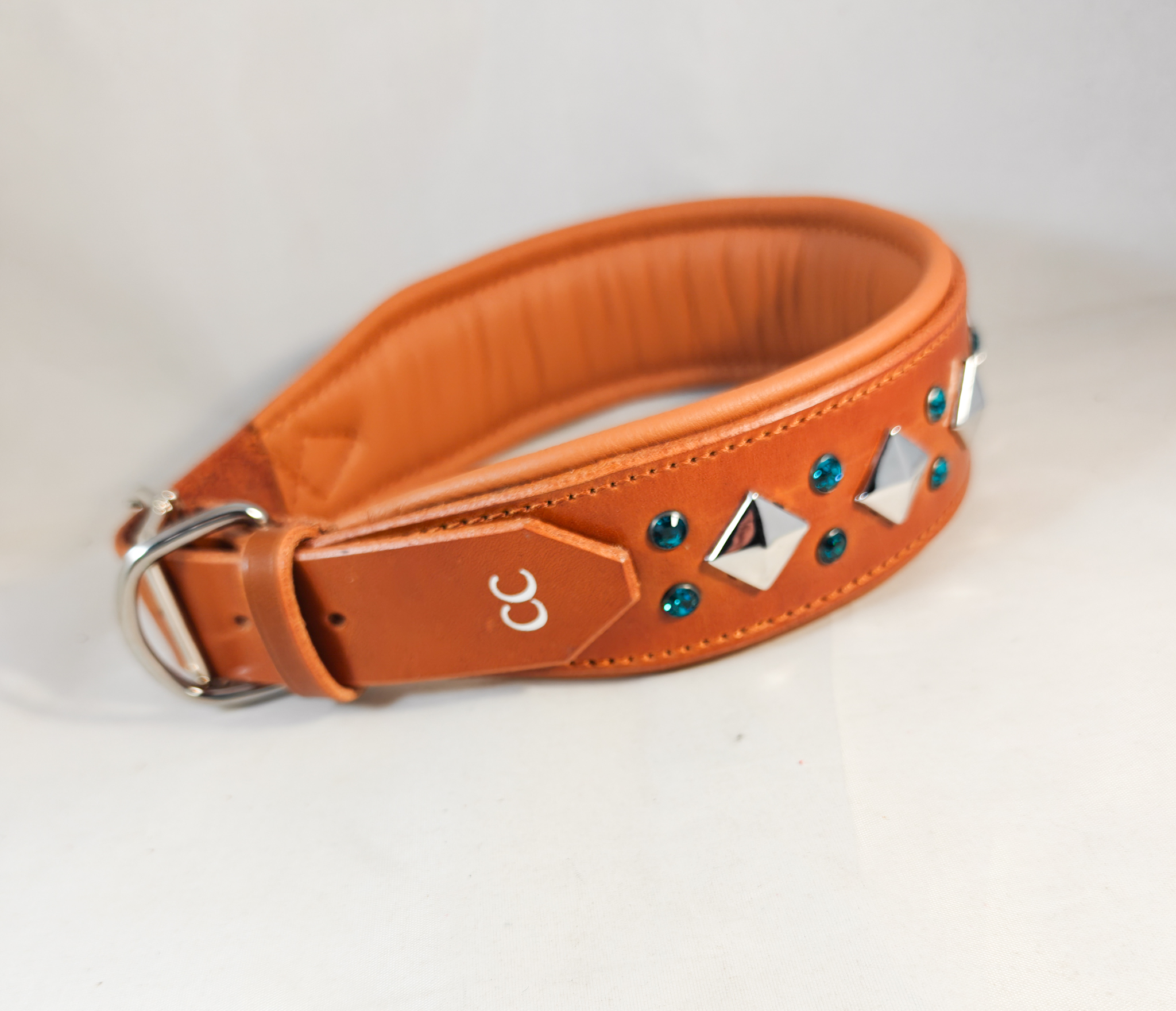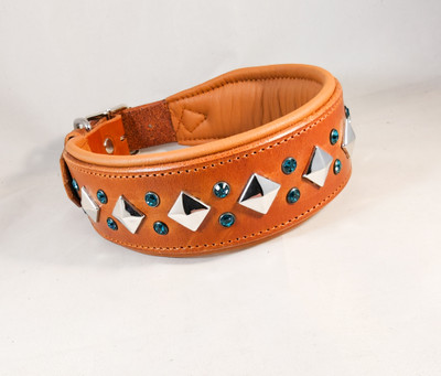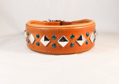 Solkipanta niitti- ja kristallikoristeilla. Pannan leveys on valittavissa (vähintään 4,5 cm) ja kokovaihtoehtoja on useita. Koristeniitit ovat pyramidiniittejä ja niiden väri on hopea, kristallien väriksi voit valita haluamasi värin. Myös pehmustenahan värin voit valita oman mieltymyksen mukaan.