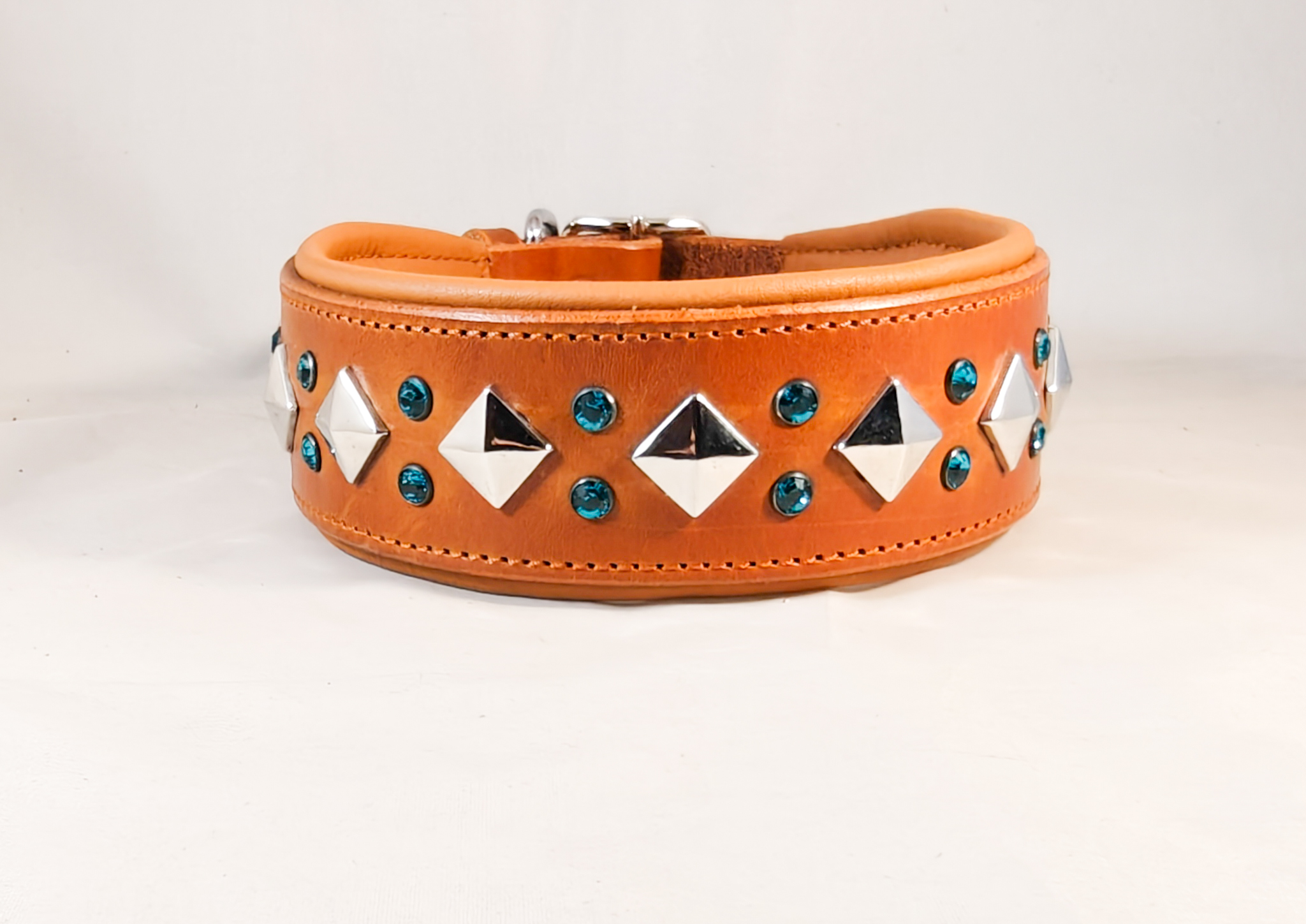 Nahkainen solkipanta, koristeena hopeiset pyramidiniitit ja Swarovskin kristallit. Eri leveyksiä ja värejä saatavana!
