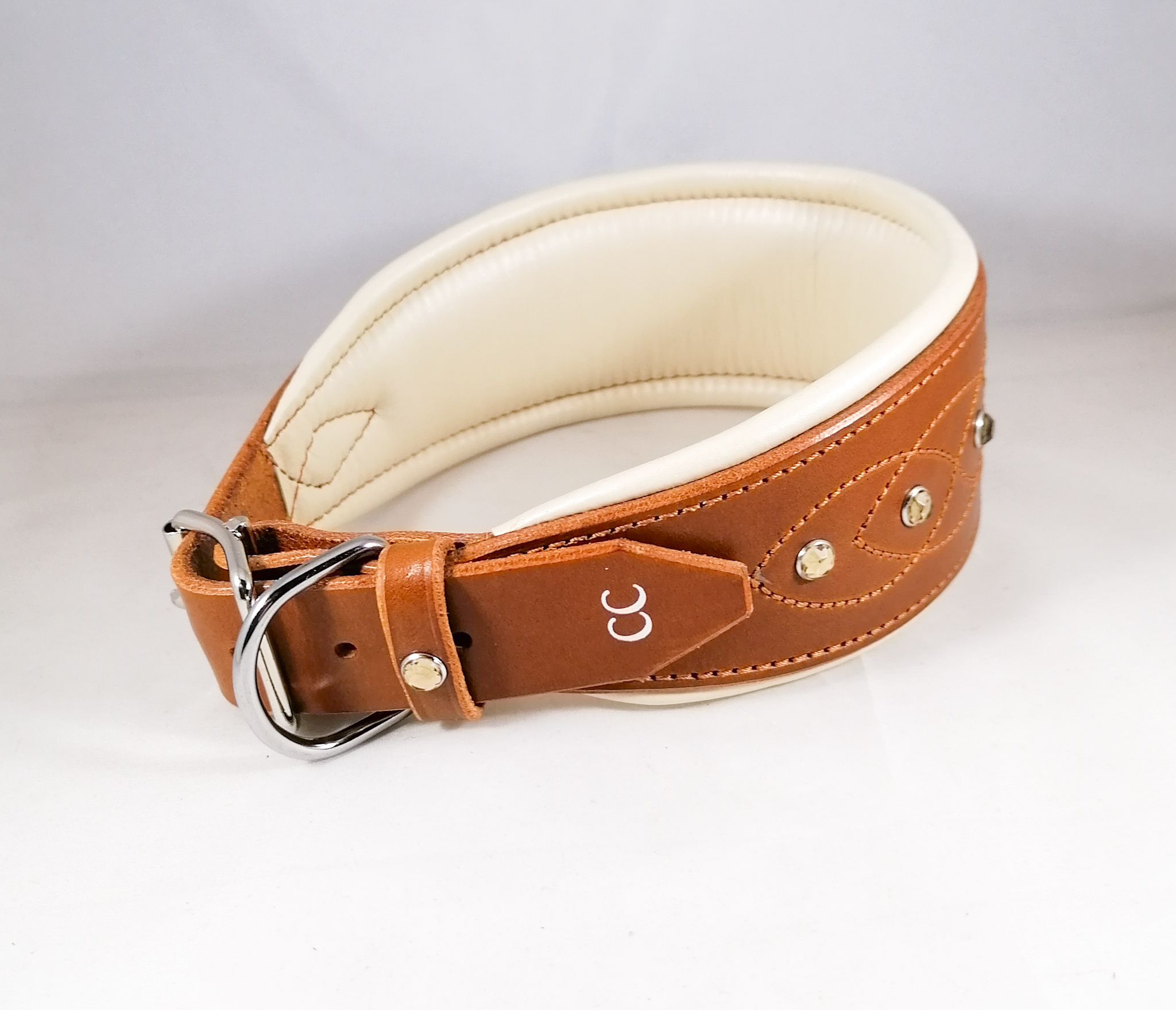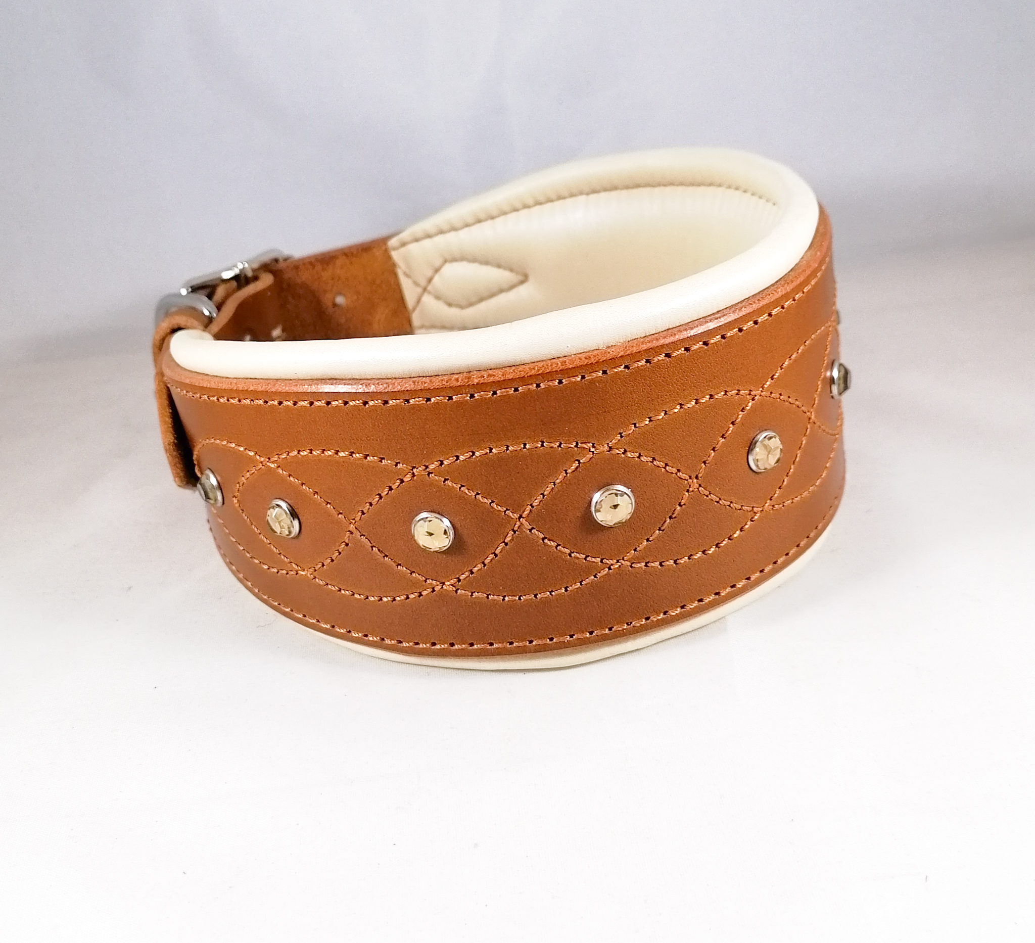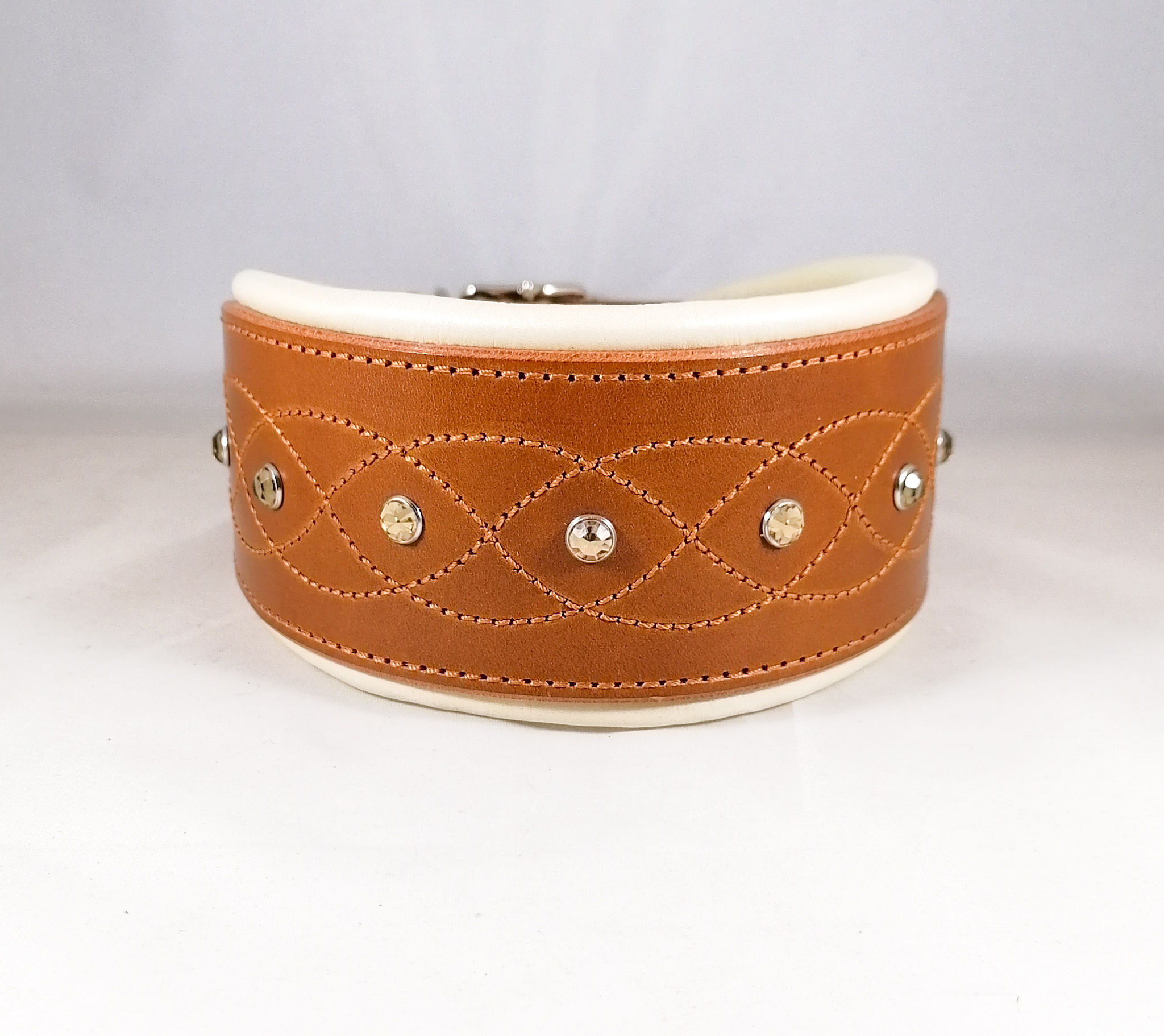 Solkipanta, jossa on koristeena strassit ja pyöreälinjainen ommel. Pannan leveys on vähintään 5 cm ja kokovaihtoehtoja on useita. Kaulapanta on vinttikoiramallia, eli se kapenee solkea kohti.