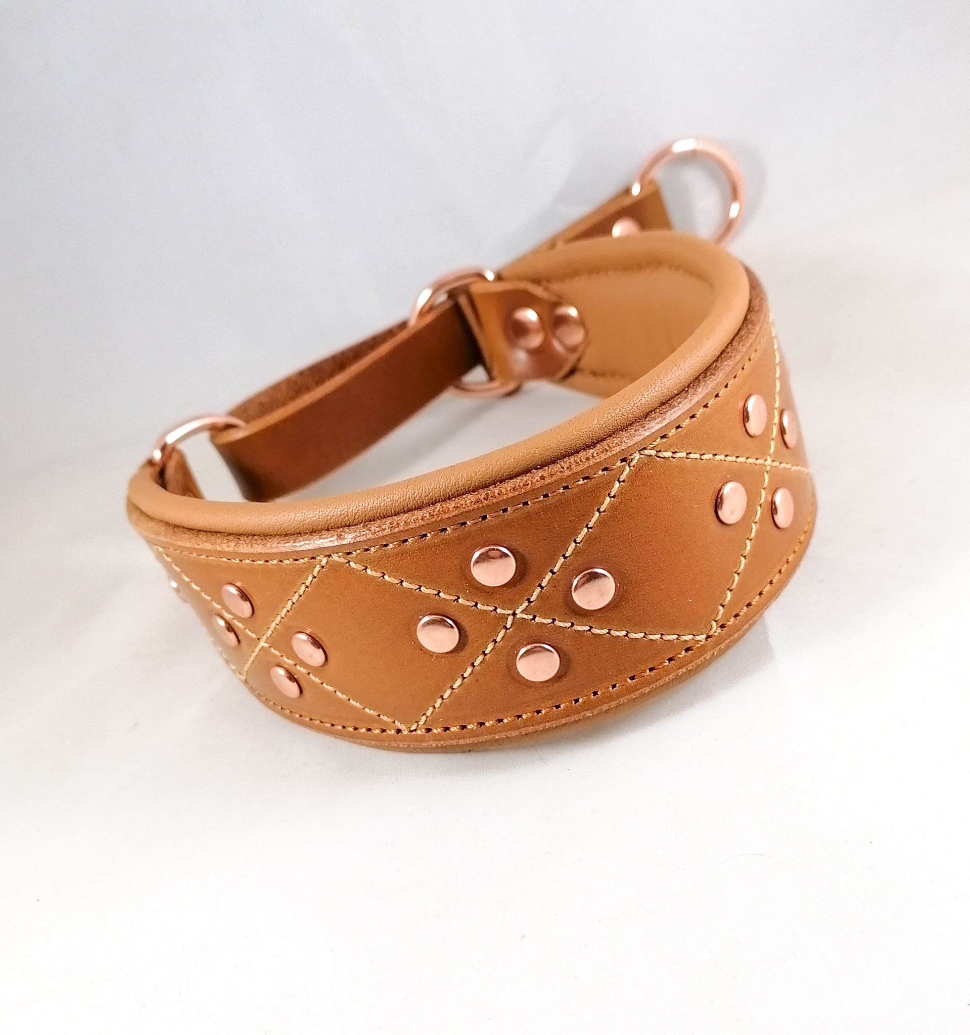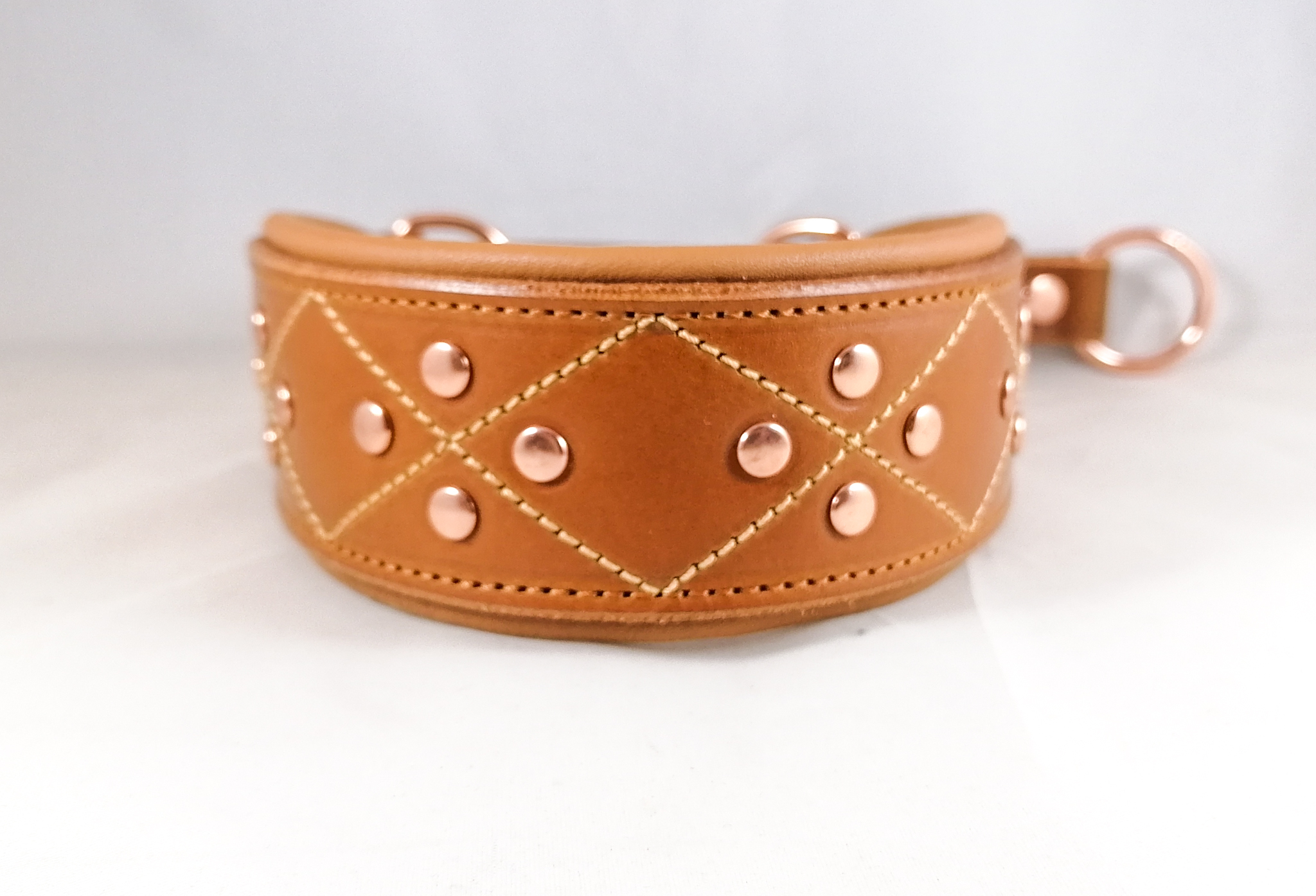Puolikiristävä nahkapanta ommelkoristeella ja ruusukullan värisillä pyöreillä niiteillä. Pannan leveys on n. 5 cm ja sisämitta on kireimmilään 33 cm, kiristävä osa nahkaa, solkien väri ruusukulta. Väri vaaleanruskea, pehmuste vaalea konjakki.