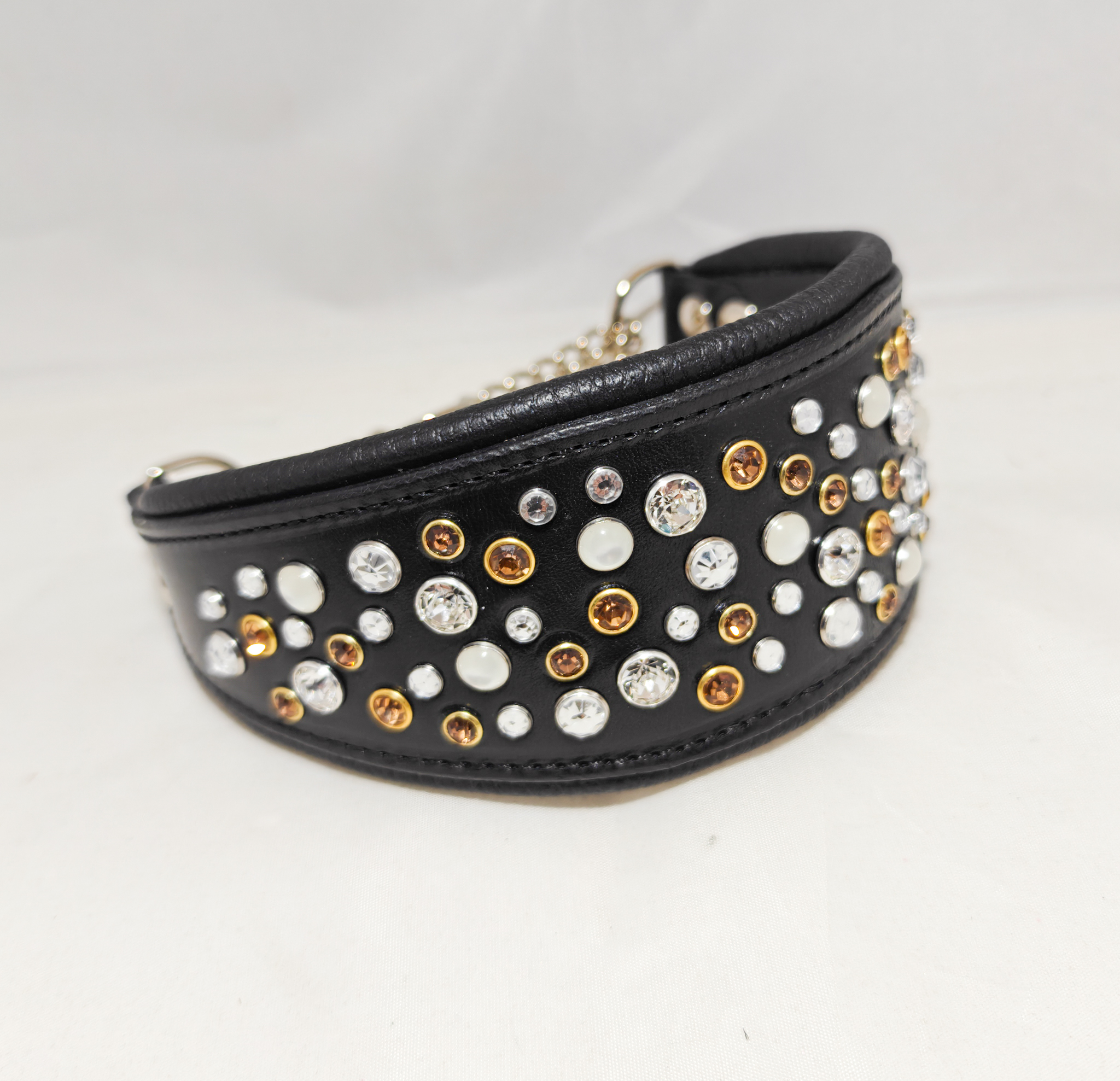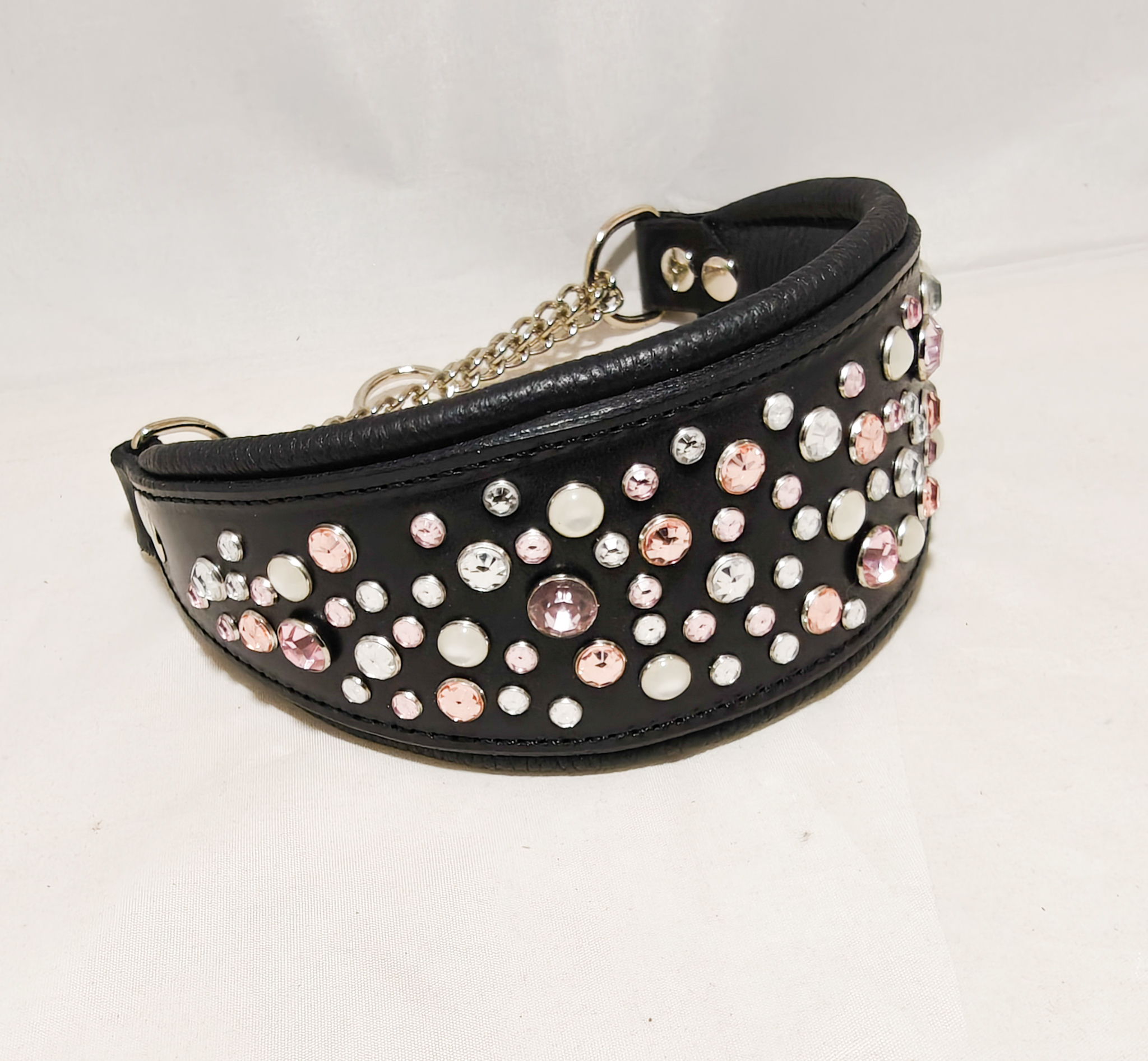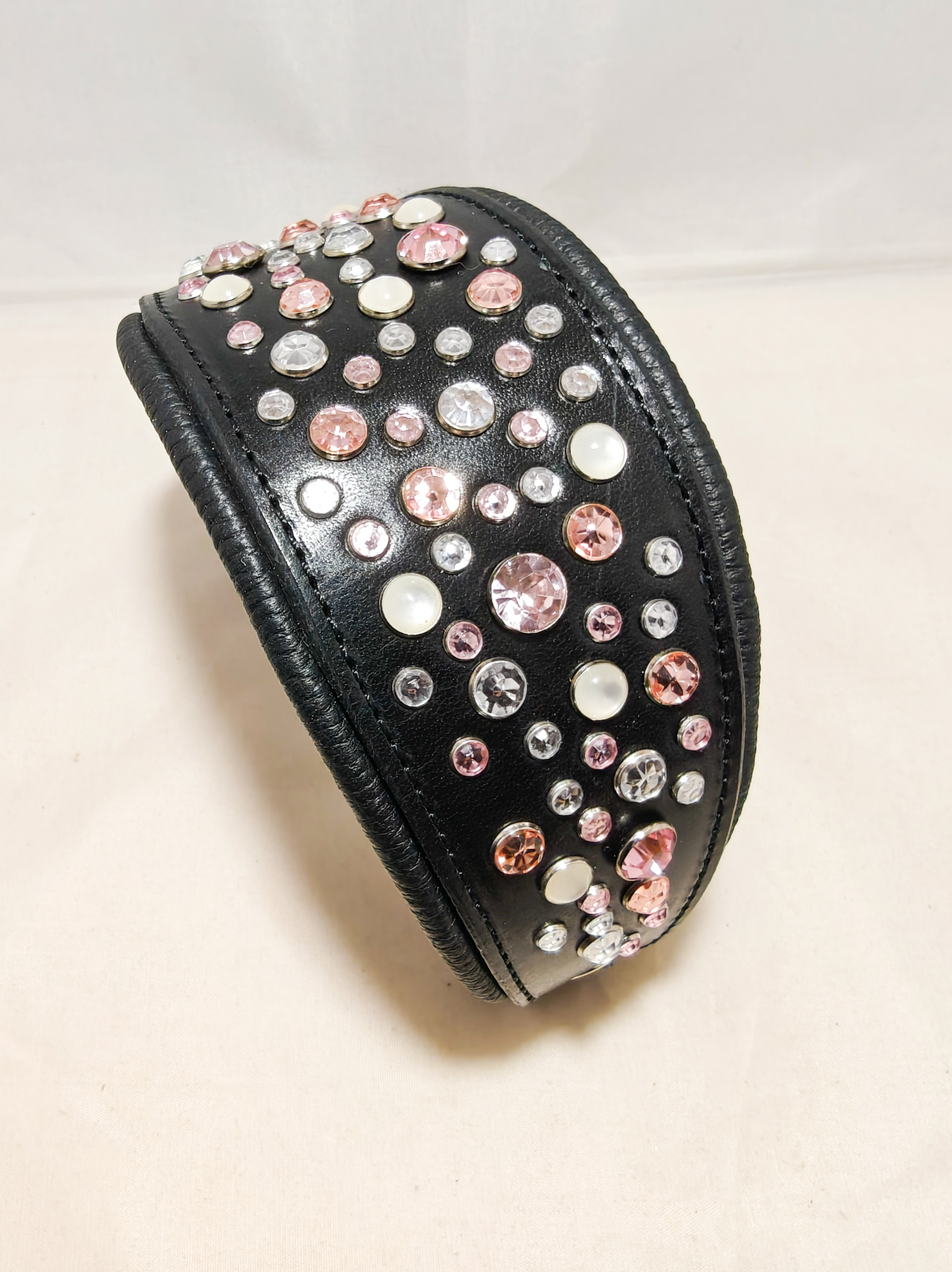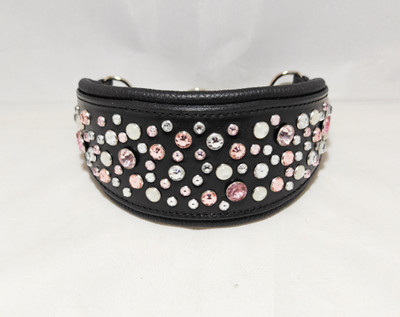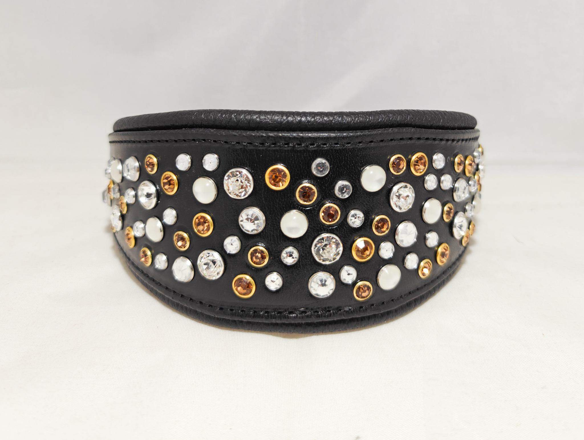 Kaunis puolikiristävä nahkapanta, jossa on koristeena strasseja. Pannan leveys on valittavissa (vähintään 5 cm) ja kokovaihtoehtoja on useita. Strasseja voit valita joko yhtä tai useampaa sävyä. Huomaathan, että isoimpia (10 mm) strasseja on saatavana vain ensimmäisen strassivaihtoehdon väreissä.