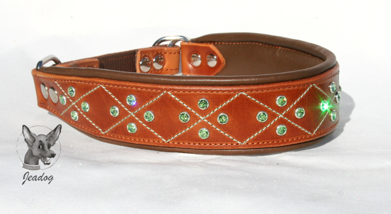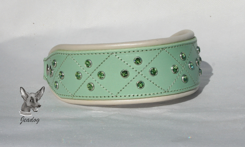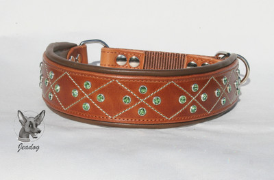 Puolikiristävä nahkapanta, jossa koristeena salmiakkiommel ja Swarovskin kristallit. Pannan leveys on valittavissa (vähintään 5 cm) ja kokovaihtoehtoja on useita.