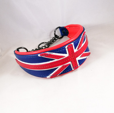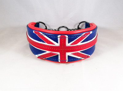 Tyylikäs nahkapanta Union Jack tyyliin. Pannan leveys on valittavissa (vähintään 5 cm) ja kokovaihtoehtoja on useita. Pannan väri on sininen ja pehmusteena on punainen nahka.