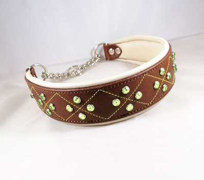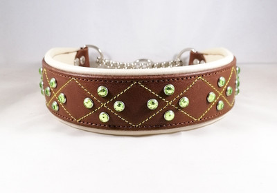 Puolikiristävä nahkapanta, jossa koristeena salmiakkiommel ja strassit. Pannan leveys on valittavissa (vähintään 5 cm) ja kokovaihtoehtoja on useita.