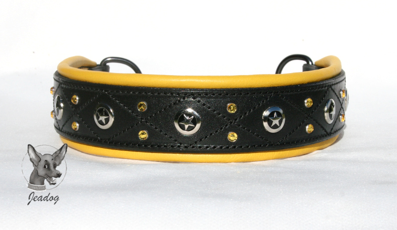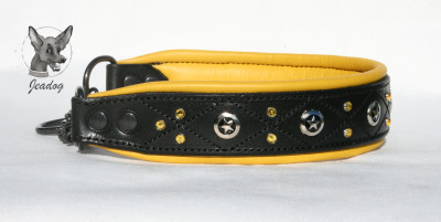 Kaunis puolikiristävä nahkapanta, jossa on koristeena ompeleet, pienet seriffi-tähdet ja 5 mm kokoiset kauniit strassit! Pannan leveys on valittavissa (vähintään 5 cm) ja kokovaihtoehtoja on useita.