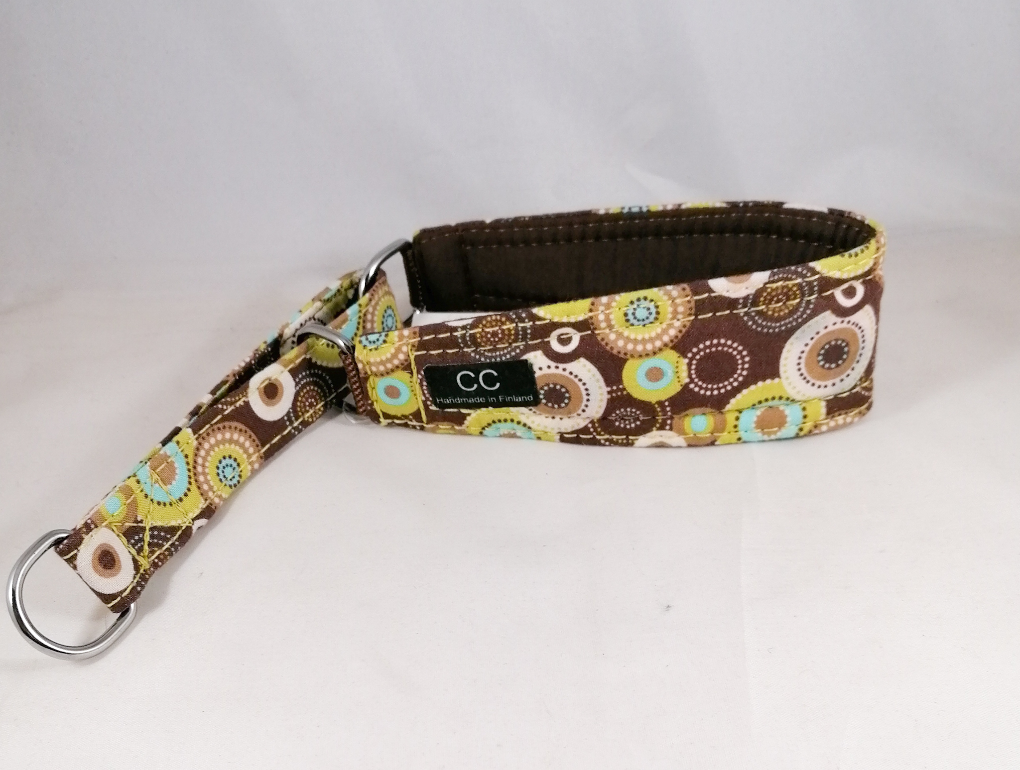 Kangaspanta, retrokuosi. Taustakankaana ruskea puuvillakangas. Pannan leveys on 5 cm ja sisämitta kireimmillään 31 cm.